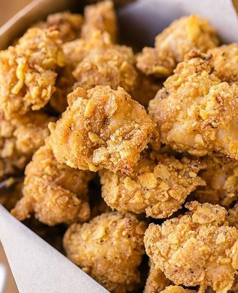 Chicken popcorn with bbq seasoning and various kinds of sauces (mayo, chili, cheese, bbq).
